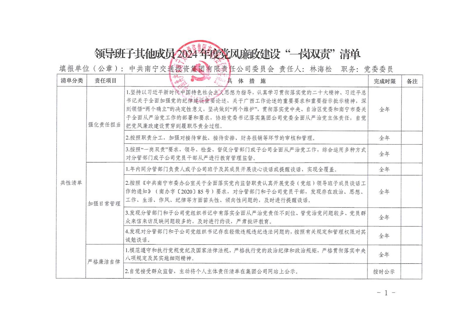 領導班子其他成員2024年度黨風廉政建設“一崗雙責”清單(四)