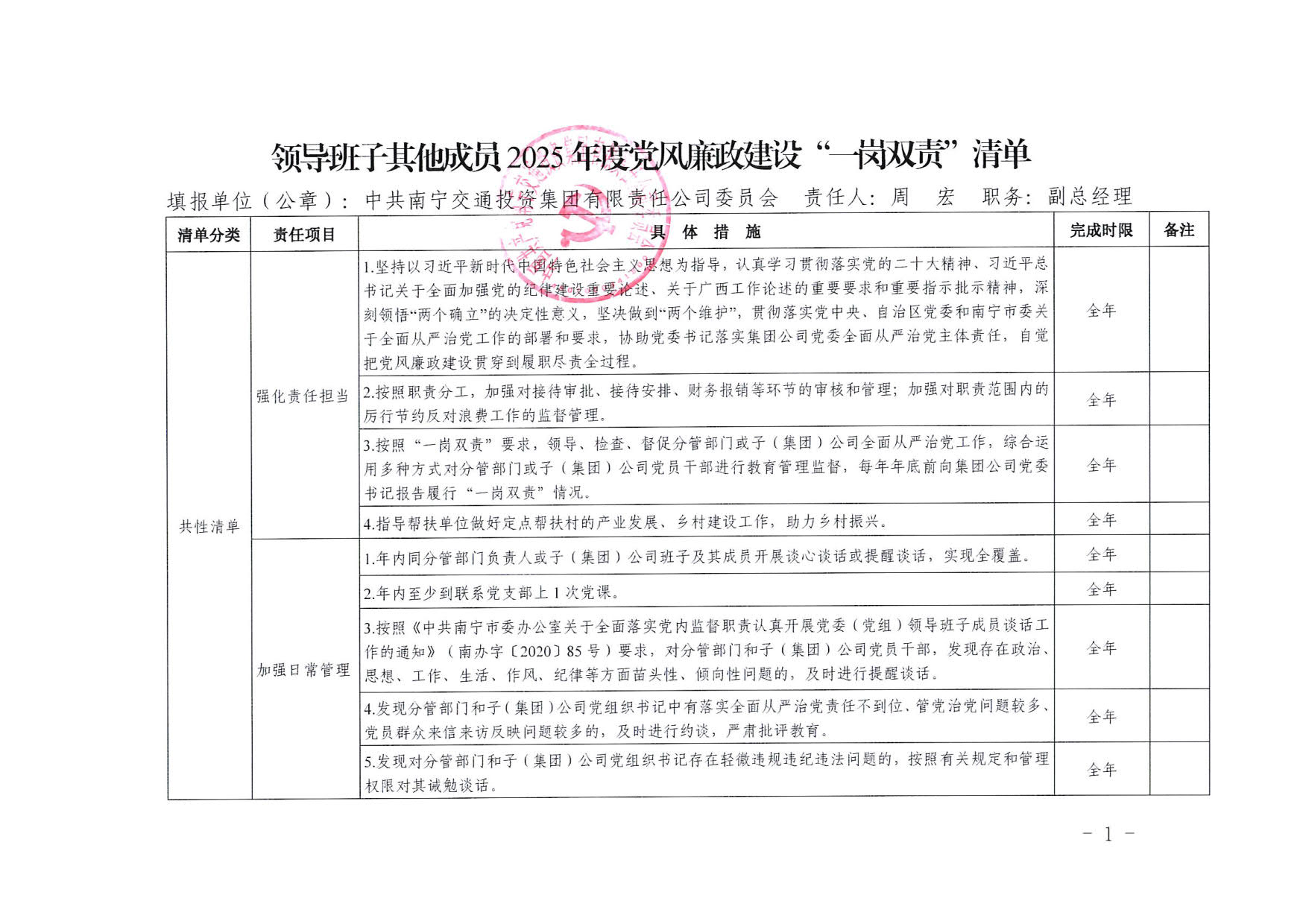 南寧交投集團領(lǐng)導(dǎo)班子其他成員2025年度黨風(fēng)廉政建設(shè)“一崗雙責(zé)”清單(七)